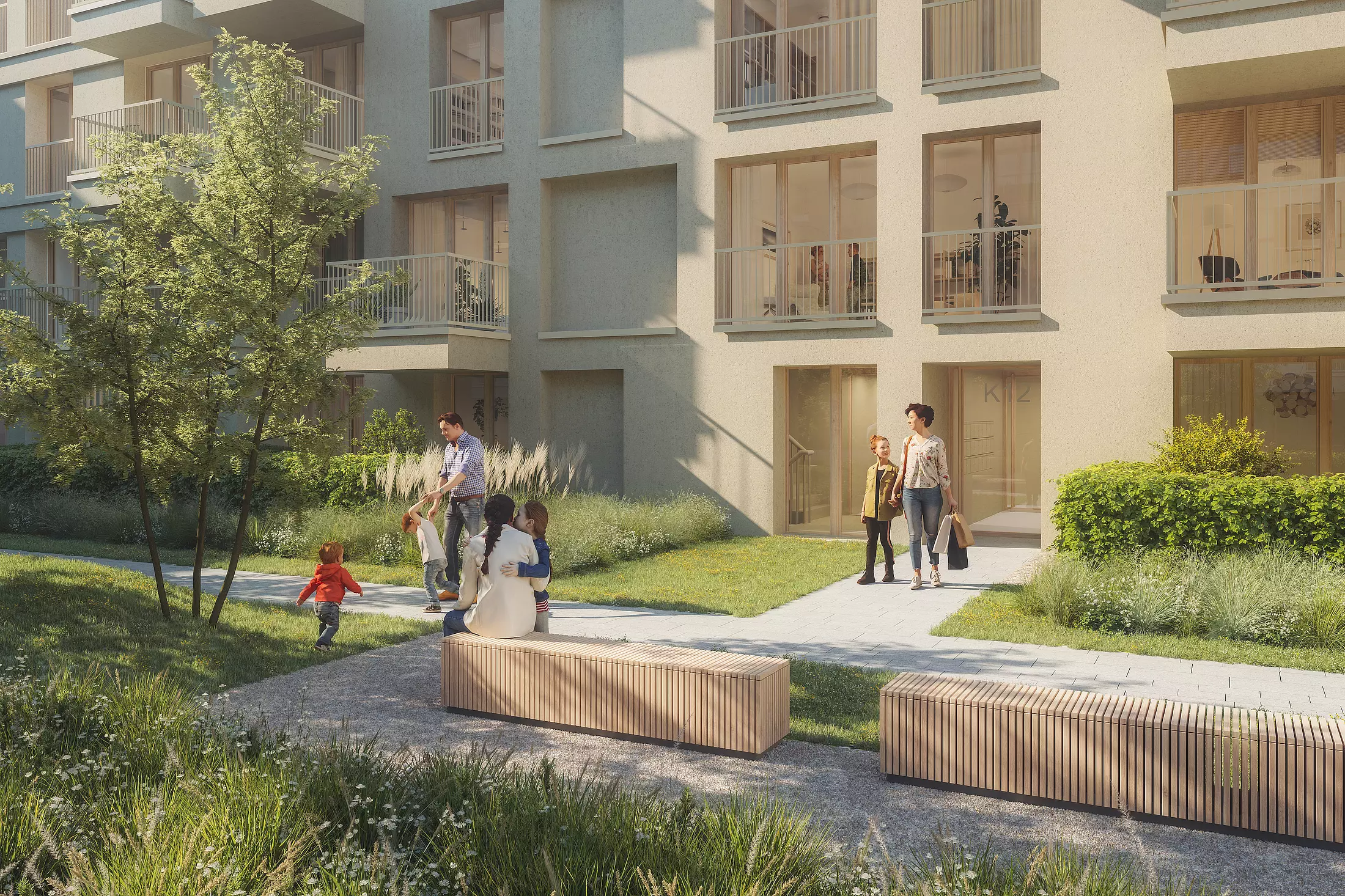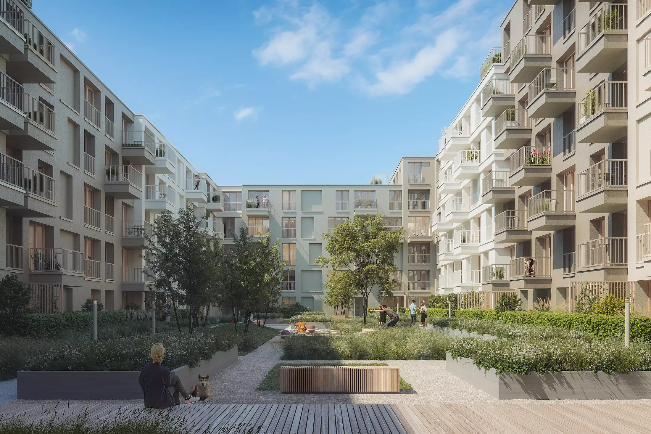 Przestronny, zielony dziedziniec otoczoną przydomowymi ogródkami z placem zabaw i strefami relaksu.